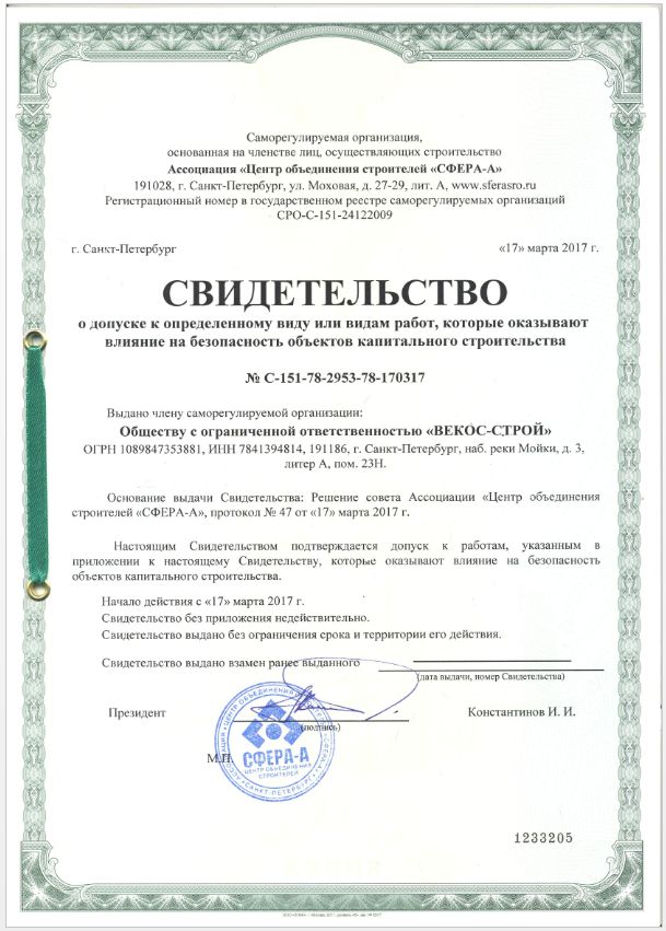свидетельствo о допуске к работам: